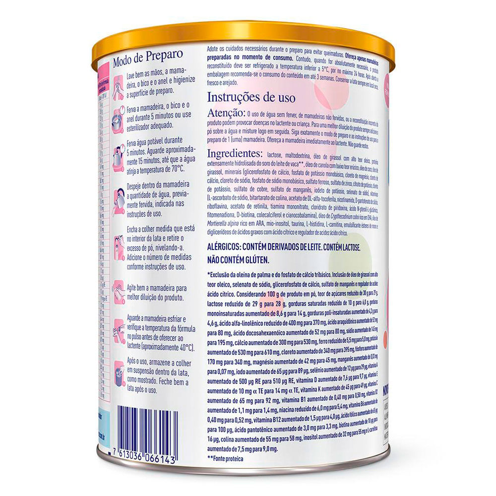 Fórmula infantil para lactentes e de seguimento para lactentes e crianças de primeira infância destinada a necessidades dietoterápicas específicas, à base de proteína extensamente hidrolisada. Com DHA e ARA. Proteínas de soro extensamente hidrolisadas com lactose, para o tratamento dietético de lactentes com alergia à proteína do leite de vaca. Recomendado para lactentes e crianças de primeira infância, 0-36 meses de idade.