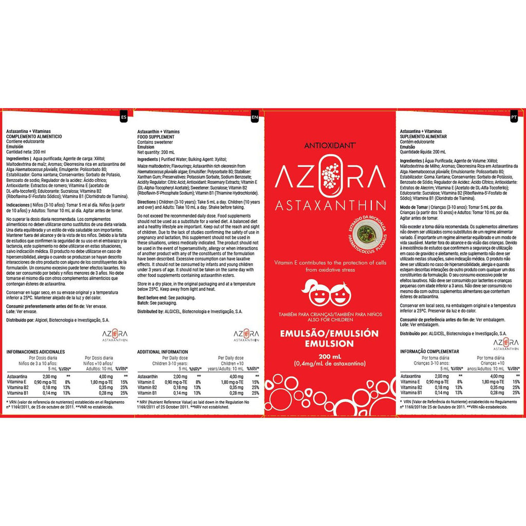 Azora Astaxanthin agora disponível em Emulsão, para reforço do sistema imunitário das crianças ou adultos com dificuldade em deglutir cápsulas. Azora Astaxanthin Emulsão é um potente antioxidante natural, com atividade anti-inflamatória e de alta eficácia, com sabor agradável.