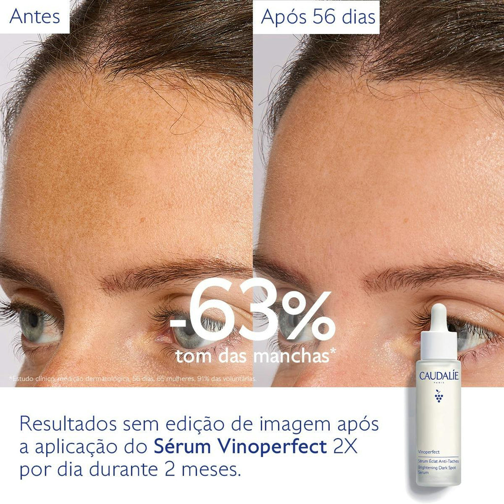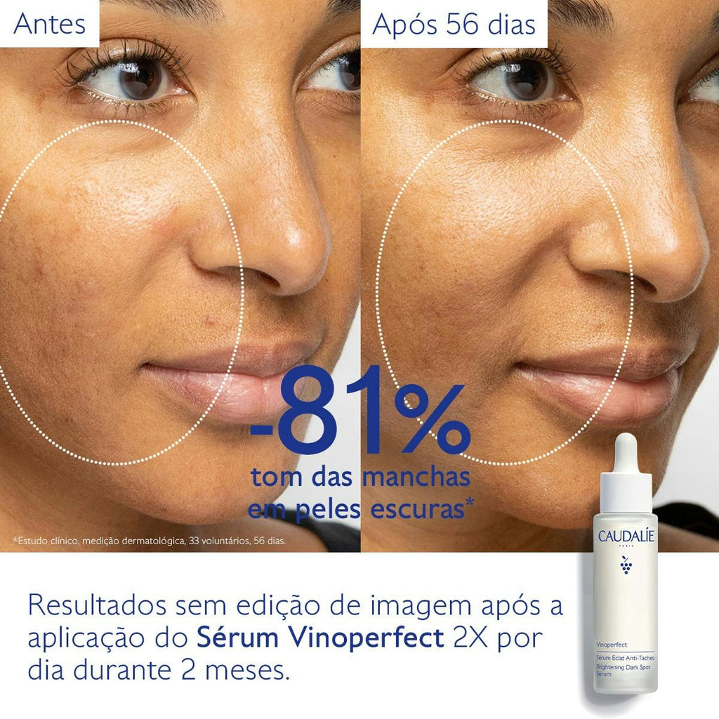 NOVO Produto de culto da Caudalie, o Sérum Luminosidade Antimanchas Vinoperfect já conquistou milhões de mulheres pela sua ação antimanchas excecional. Em 2021, reinventa-se mais eficaz, mais clean & mais natural. Este sérum corrige o aspeto das manchas existentes e uniformiza a tez para a tornar mais luminosa. Atua sobre todo o tipo de manchas (sol, acne, melasma, envelhecimento) e todo o tipo de pele, mesmo a mais sensível. A sua fragrância fresca e subtil associa as notas verdes de flor de cidra, folhas de laranjeira, melancia e menta esmagada. A Caudalie compromete-se: - Embalagens 100% recicláveis e concebidas a partir de vidro e plástico reciclados, para um objetivo zero desperdício**. * Caudalie é líder no mercado despigmentante facial mulher H16.4.4., em farmácias, em vendas em valor e em unidades, em YTD e em MAT, dados Dezembro 2020, fonte hmR, Health Market Research. **Onde existam instalações apropriadas. Exceto doseadores e tampas multimateriais, recicláveis unicamente nas Boutiques SPA Caudalie graças à parceria com Terracycle. Vantagens: Corrige as manchas, uniformiza a tez e ilumina a pele. No coração da fórmula do Sérum Vinoperfect, a Viniferina, ingrediente patenteado de Caudalie proveniente da seiva da videira, que assegura uma ação antimanchas excecional 62 vezes* mais eficaz do que a vitamina C. *Teste in vitro sobre a ação inibidora da Viniferina na tirosinase. Fórmula com 98% de ingredientes de origem natural. Testado sob controlo dermatológico. Fórmula oil free e não fotossensibilizante. Adequado para mulheres grávidas e a amamentar. E, como todos os produtos Caudalie, sem parabenos, fenoxietanol, ftalatos, óleos minerais, PEG, ingredientes de origem animal. Nota Yuka: Excelente